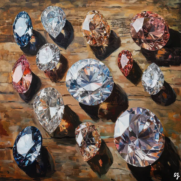 The artist skillfully captures the complex interplay of light as it dances through the various hues—from deep sapphires and soft pinks to brilliant whites and warm champagnes. Each facet is a deliberate stroke of the brush, building a sense of intense clarity and fire within each gem. This strict 1-of-1 masterwork is a sophisticated statement piece that brings a sense of opulence and meticulous craftsmanship to any modern interior.