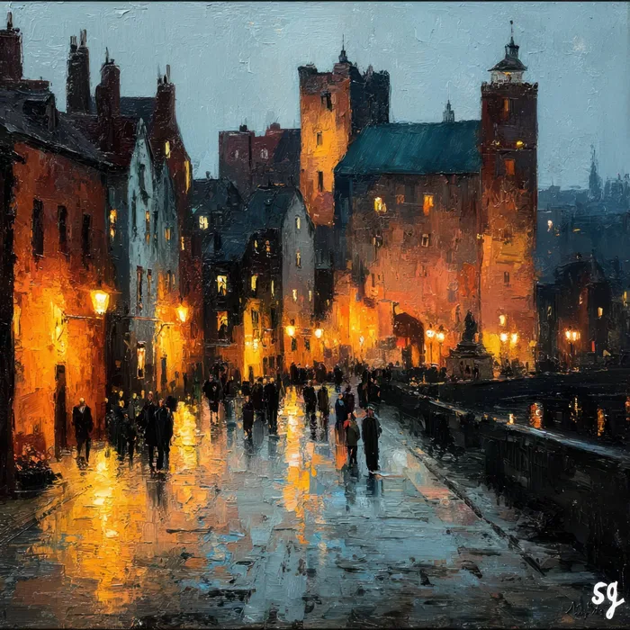 "The Amber Bridge" is a mesmerizing exploration of light and reflection in a historic urban setting. The composition transports the viewer to a rain-slicked European thoroughfare at twilight, where the ancient stone facades are set ablaze by the warm, amber glow of street lamps and interior lights. Silhouettes of passersby populate the scene, adding a layer of mystery and human narrative to the architectural grandeur.