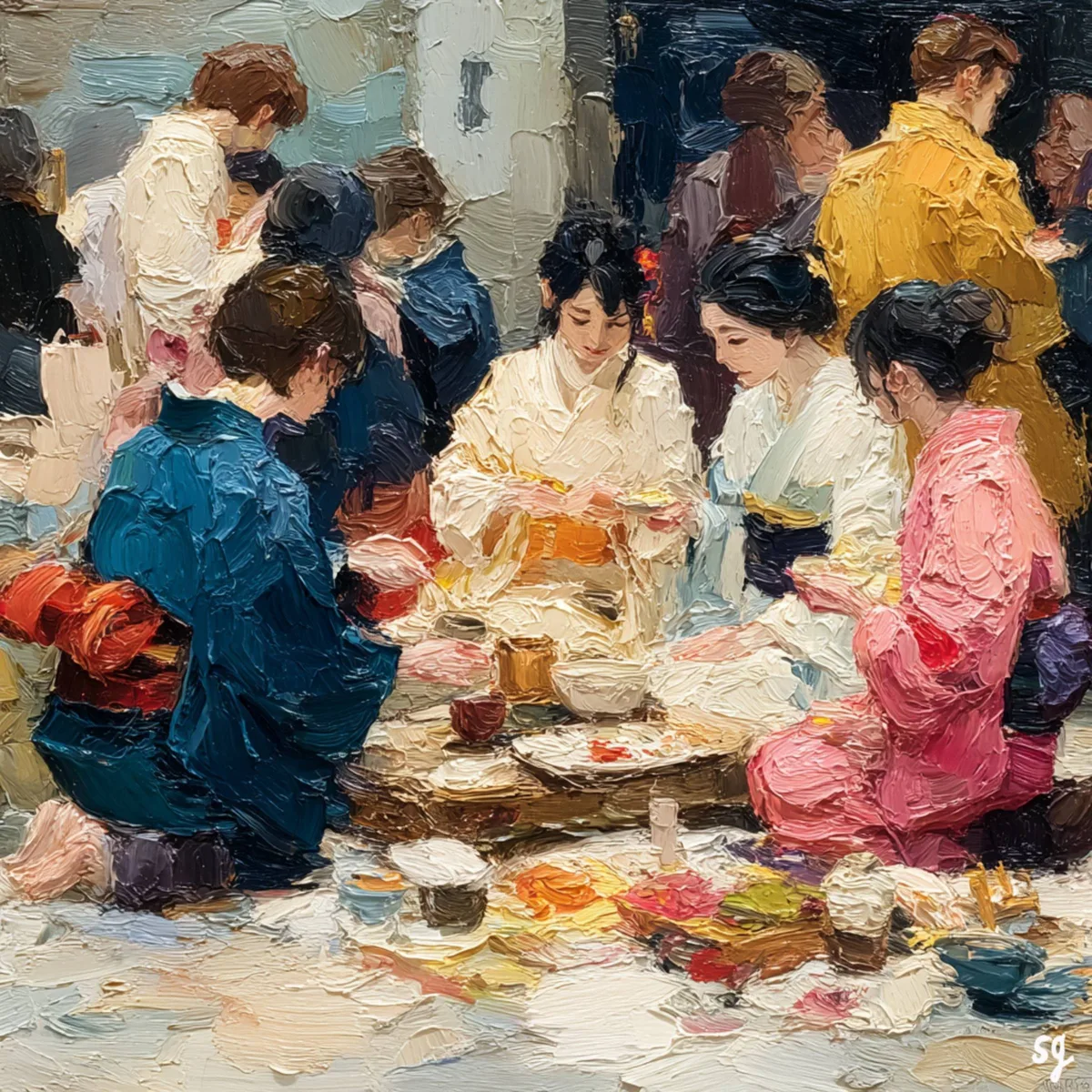 Immerse yourself in the rich cultural heritage and quiet elegance of this traditional Japanese gathering. The artwork beautifully captures a group of women gracefully dressed in vibrant, flowing kimonos, seated together around a low wooden table for an intimate tea ceremony or shared meal. Created in our signature extreme heavy impasto style, the highly sculptural, thick palette knife strokes bring astonishing tactile depth to the heavy folds of the colorful silk fabrics, the delicate hair details, and the beautifully arranged, rustic table setting. A deeply harmonious and captivating statement piece that adds sophisticated cultural charm and a sense of peaceful community to any space.