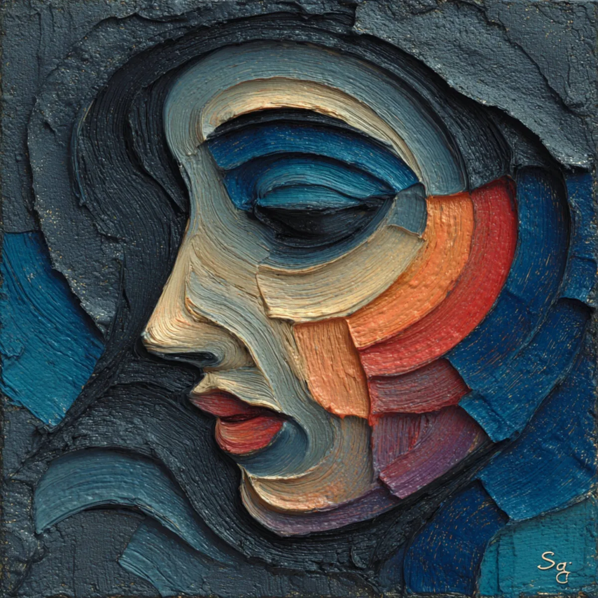 Dive into the realm of modern abstraction with this captivating, deeply emotive profile portrait. The artwork features a serene face with softly closed eyes, beautifully constructed from bold, sweeping geometric curves and waves of color. Created in our signature extreme heavy impasto style, the thick, highly sculptural palette knife strokes bring astonishing tactile depth and movement to the piece. A striking contrast is formed between the deep, moody blues and greys of the background and the vibrant, warm gradient of reds, oranges, and peach tones that illuminate the subject's cheek. A deeply contemplative and sophisticated contemporary statement piece, perfect for bringing modern elegance and emotional depth to any space.