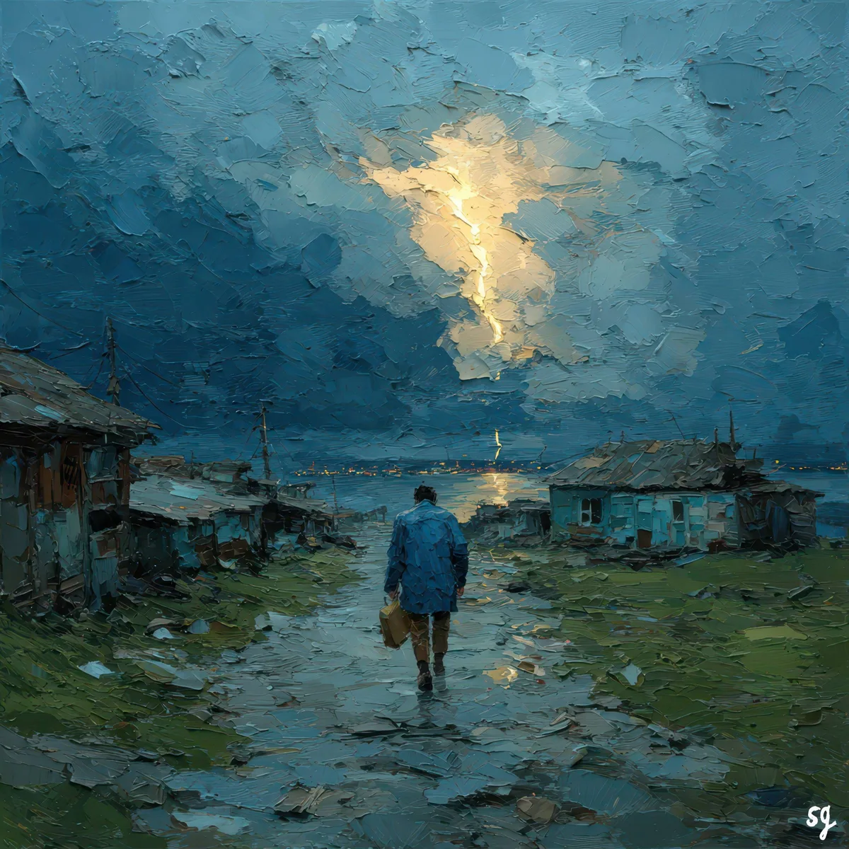 Immerse yourself in the cinematic drama of this breathtaking, atmospheric landscape. The artwork captures a solitary figure walking down a rugged, rain-slicked path through a humble coastal village. A sudden, brilliant burst of golden light pierces the heavy, turbulent storm clouds, illuminating the wet earth and the distant, glowing horizon. Created in our signature extreme heavy impasto style, the thick, sweeping palette knife strokes bring astonishing tactile depth to the moody sky, the muddy road, and the weathered cabins. A deeply emotional and powerful statement piece that speaks of resilience, solitary journeys, and finding light in the darkness.