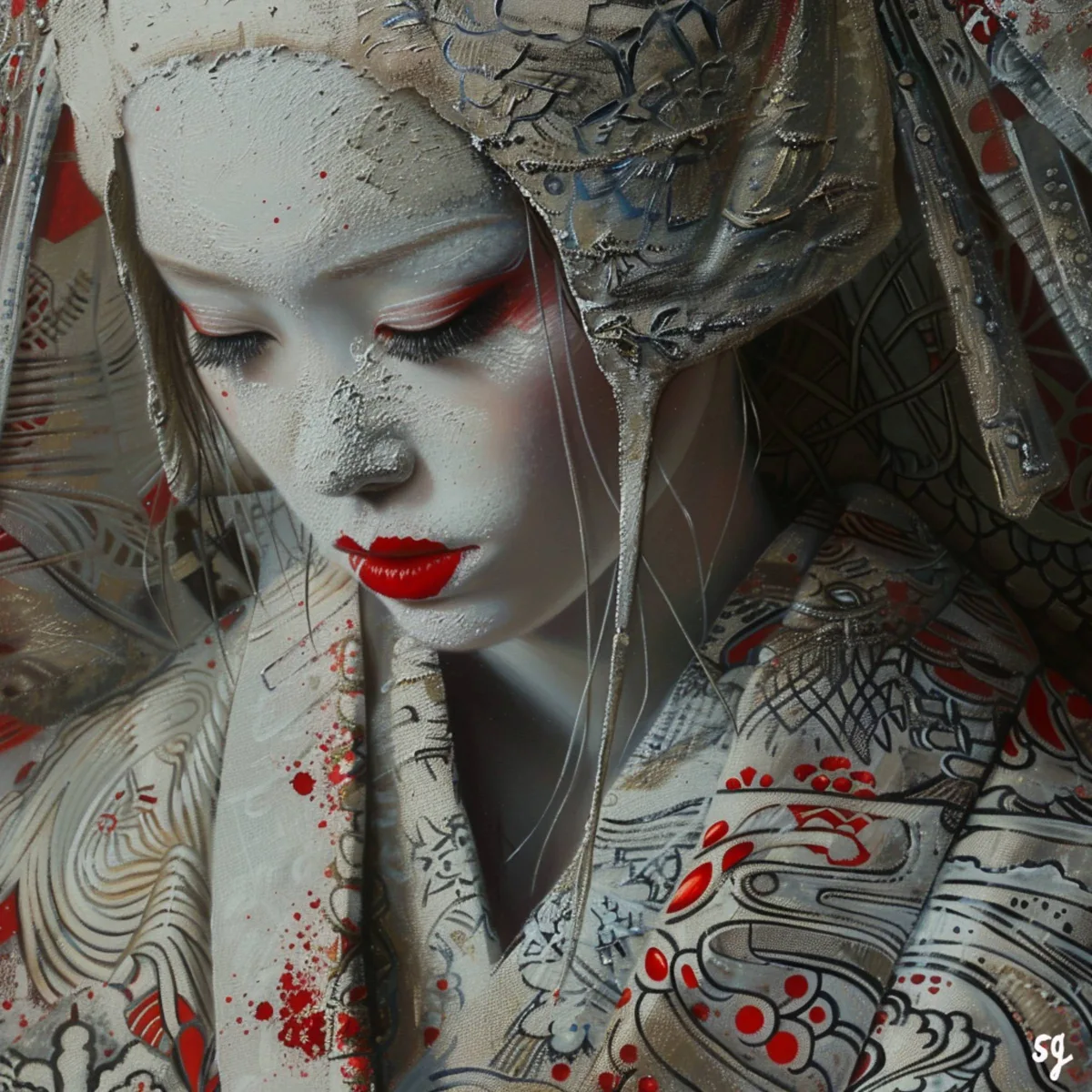 Immerse yourself in the profound elegance of this traditional Japanese-inspired portrait. This striking artwork captures the delicate beauty of a geisha, featuring a mesmerizing contrast between the cracked, porcelain-like white makeup and the vivid crimson accents. Created in our signature extreme heavy impasto style, the intricate textures of the traditional garment and the emotional depth of the subject are brought to life through masterful, thick palette knife strokes. A perfect blend of ancient tradition and bold, contemporary texture.
